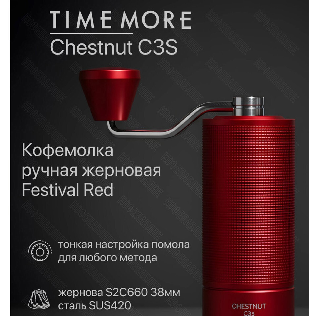 Кофемолка ручная Timemore Chestnut C3S Festival Red — это популярный жерновой гриндер с красным анодированным алюминиевым корпусом и острыми стальными жерновами S2C (Spike-to-Cut) 38 мм, обеспечивающими быстрый и равномерный помол с минимальным количеством "пыли", отлично подходящий для фильтр-кофе, аэропресса и эспрессо; она предлагает внешнюю ступенчатую регулировку помола, удобство в использовании и стильный дизайн, что делает ее выбором для любителей качественного кофе Основные характеристики:- Тип: Ручная жерновая кофемолка.